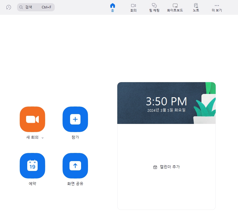 3. 로그인을 완료하면 메인 홈 화면이 나오는데요. 회의 시작을 원하시면 새회의를 참가를 원하시면 참가를 눌러 회의를 시작해보세요. 오디오 및 화면을 잘 확인하시고 참여하시기 바라겠습니다.