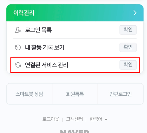 ④ 이력관리 내 연결된 서비스관리에 확인을 눌러줍니다.