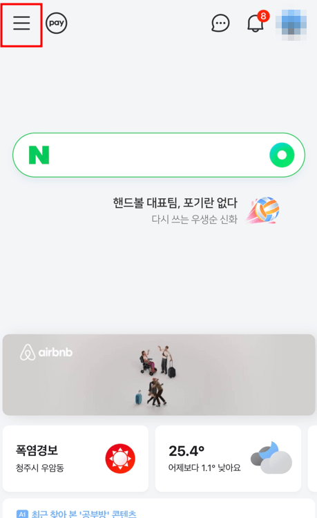 ① 네이버 메인화면에서 좌측 상단 메뉴를 눌러줍니다.