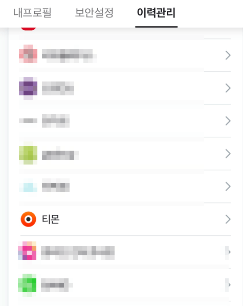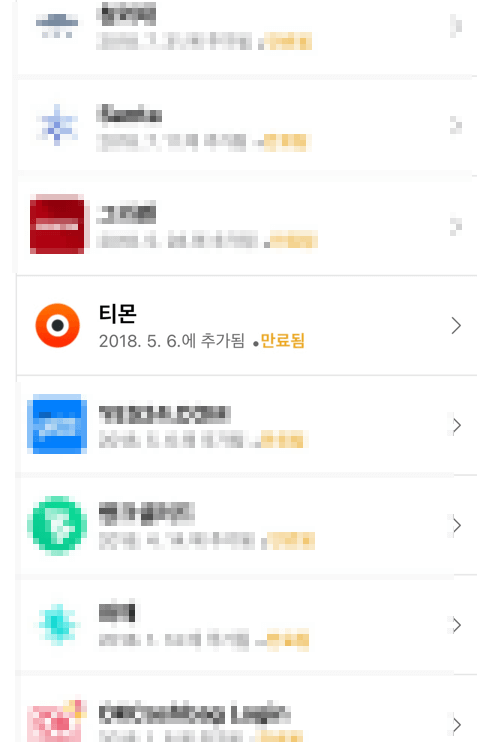 ④ 생각지도 못하게 많은 페이지들이 나오는데요. 사용하지 않는 사이트들은 이참에 정리하시는 게 좋을 것 같습니다. 티몬을 찾아 눌러줍니다.