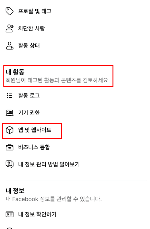 ③ 설정에 들어갔으면 내 활동을 찾고 앱 및 웹사이트를 눌러줍니다.