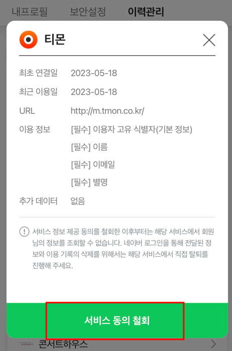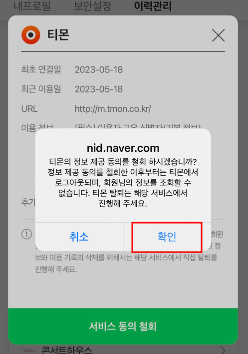 ⑥ 서비스 동의 철회 후 확인을 눌러주면 네이버와 연동도 끊기게 됩니다.