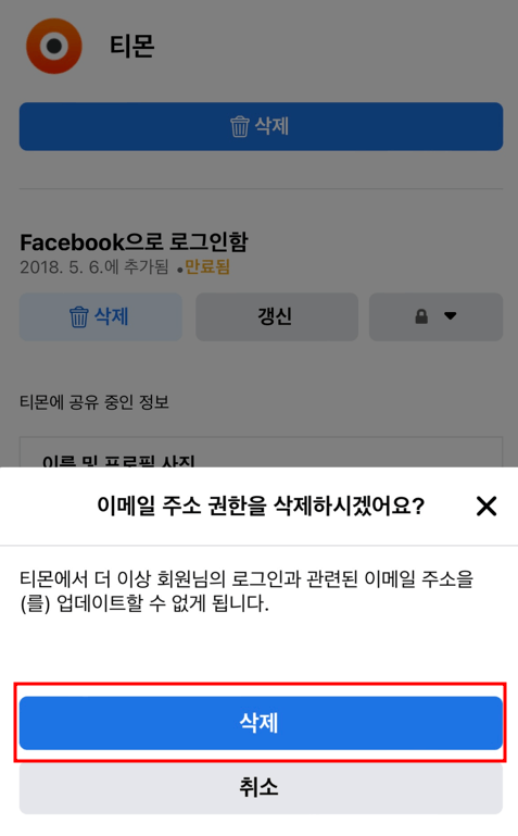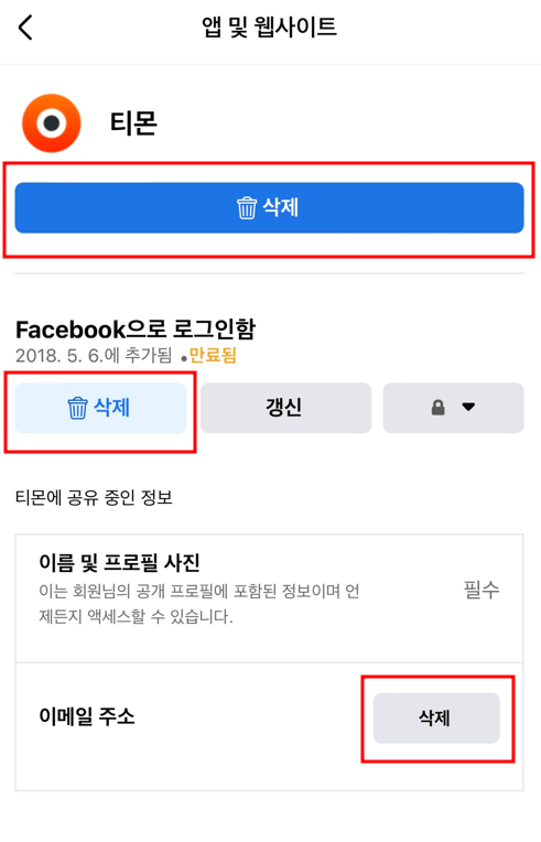 ⑤ 저는 삭제 보이는 것들은 다 눌러주었습니다. 다 누르면 페이스북과 연동이 해제 됩니다.