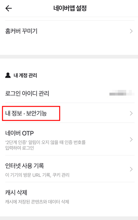 ③ 네이버앱 설정에 들어간 후 내정보, 보안기능을 눌러줍니다.