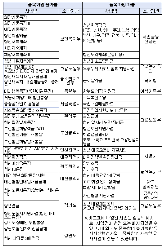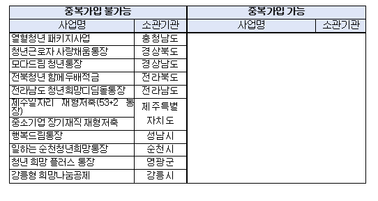 희망두배 청년통장 유사사업 중복참여 여부 비교표